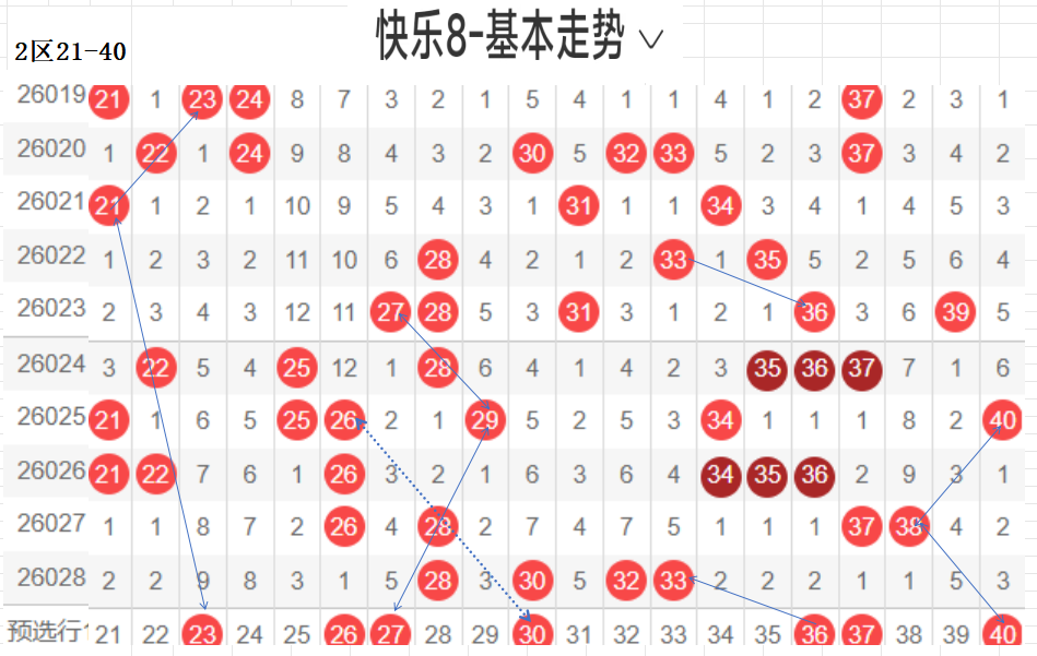 二区(21-40):遗漏5期以下有18,028 30 32 33  4,数据所示,冷码平均,选择条件增多了.上期开出了4个号码,出码比较分散.这期布防相应增加,重码按比例落这区较少,先给出关联码23,这个区间间接走势,温区,21-30区间上期开了2个,依旧不是重点选号区间,31-40区间开出2个,本期关注热码的回补,间隔小遗漏值最佳,3字头转热,这个小区热码注意回调,可以做关联码的布局,注重温冷码的回补.