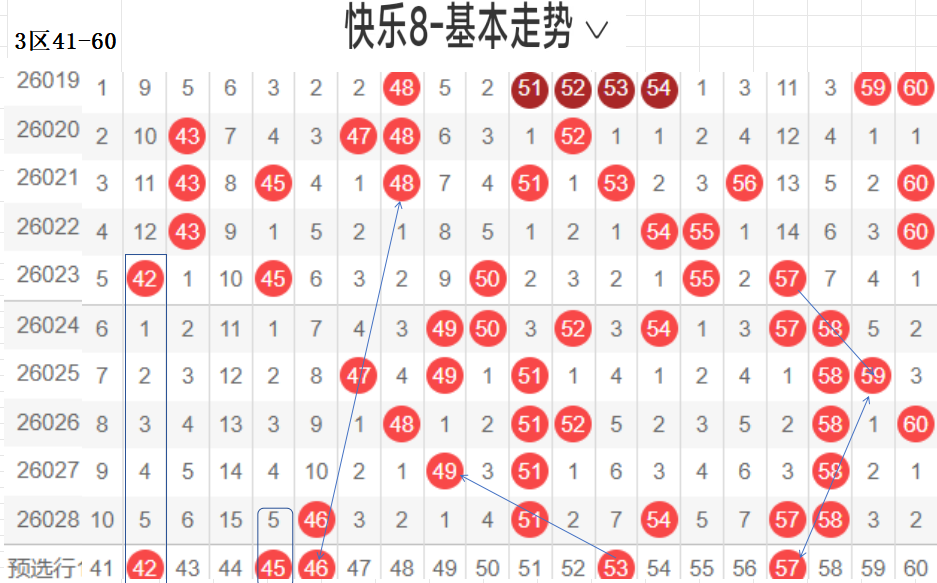 三区(41-60):遗漏5期以下有15,046 51 54 57 58  5,温开方式,这区码数有回暖之意,可以防一手,先定胆码走势较大者,隔期,斜三连,分边号码,可重防,间隔5以上号码可以随走势选取,例如本期大冷码,走势比较大,可以做胆,通常联动可带出,分边对称的号码,本区间也有很大走势.可关注下.隐形夹角号码.做补位形态号码.都需要观察动态走势.以上是本区间的选码方法.