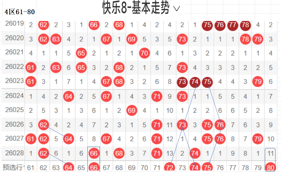 四区:(61-80):遗漏5(5)以下有13,062 66 68 71 74  5,平均温开方式,上期开出8,区间回暖,后区可防,区间从以往数据来看,重码很强,一枝独秀的存在,近期有回补走热的趋势,区间回暖,本区间后区可防,与一区相比,也是温区.,对称下落,隔期回补码,可以防,这区对呈对称三角关系的胆码,斜三连有走势的胆码,联动落位码,都有各自的走向落位关系,根据走势选择一种方式选码.