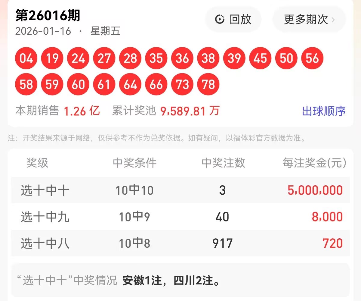上期福彩快乐8第 2026016期开奖号码为【04 19 24 27 28 35 36 38 39 45 50 56 58 59 60 61 64 66 73 78】,其中大小比11:19,奇偶比为8:12,和值为920,跨度74,四区间比为2:7:6:5。下面是对本期对于每个号码的详细分析。