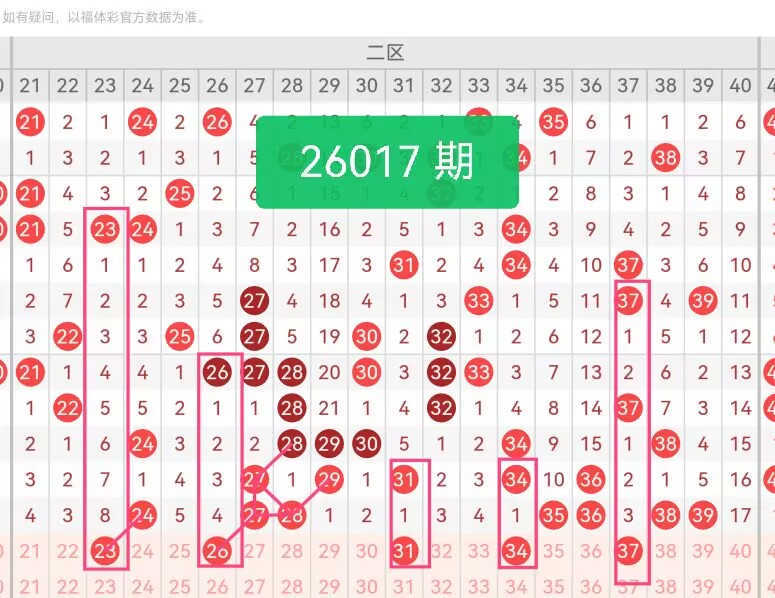 上期第二区间开奖7个号码,本期可能会减少开出。23、37作为奇数代表,近期在同类区间中出号频率较高,且与上期27、35形成奇偶呼应;26、34为偶数热号,其中34与上期36、38构成偶数递进组合,符合区间内偶数连出的历史规律;31则处于区间中部,能有效衔接前后号码,提升组合的覆盖密度。号码23、26、34、37这三个号码在走势上都与上期开出的号码形成斜连走势。