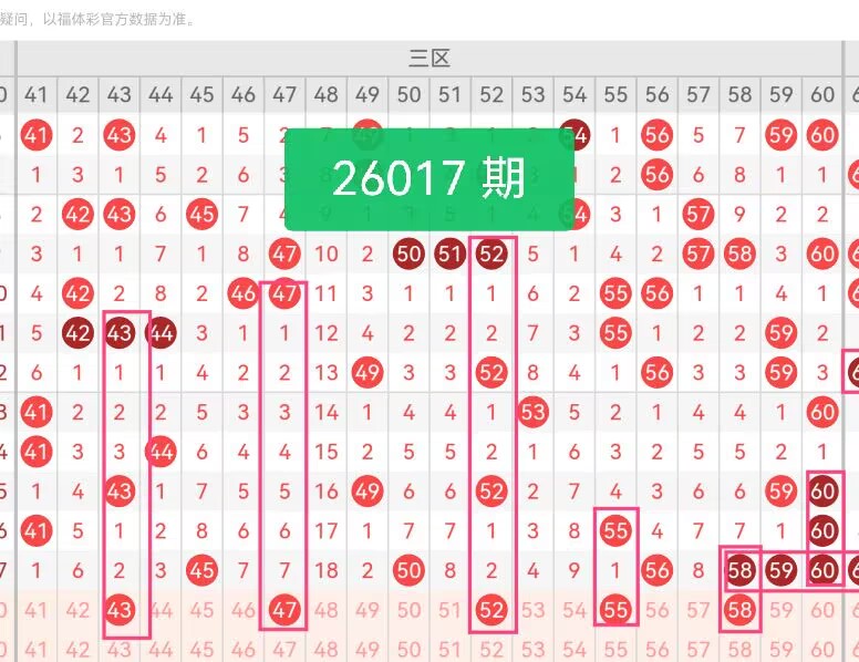 第三区间号码推荐:【43 47 52 55 58】