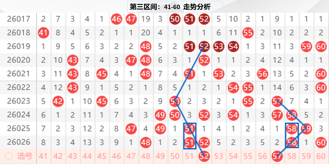 三区分析:【41-60】(走势图标注号码非小黄车大底,请谨慎参考,具体思路将在直播间分享讨论)