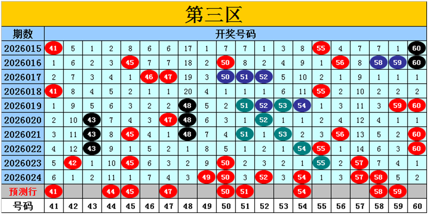 目前第三区包含11个热码:重码6个49、50、52、54、57、58,邻码1个55,孤码4个42、43、45、60;包含7个温码:邻码5个48、51、53、56、59,孤码2个41、47;包含2个冷码:邻码0个,孤码2个44、46;号码冷温热个数比为2:7:11,重号、邻码、孤码个数比为6:6:8。