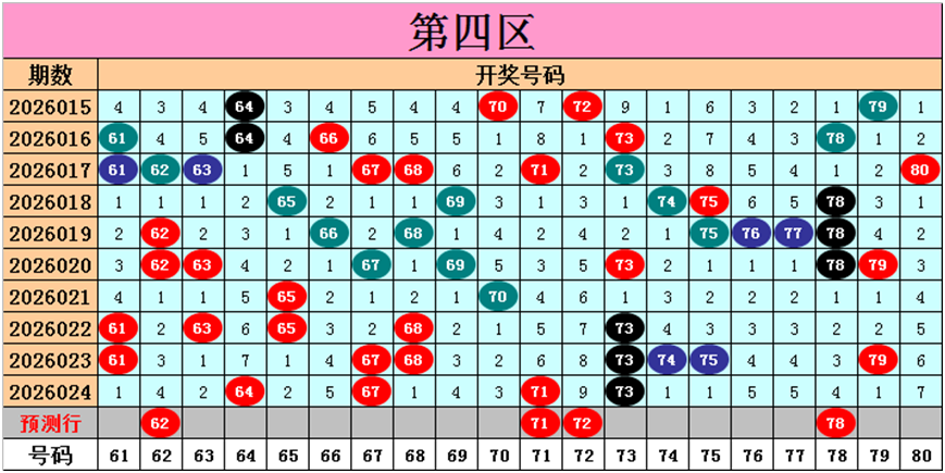 目前第四区包含11个热码:重码4个64、67、71、73,邻码4个63、65、68、74,孤码3个61、75、79;包含7个温码:邻码2个66、70,孤码5个62、69、76、77、78;包含2个冷码:邻码1个72,孤码1个80;号码冷温热个数比为2:7:11,重号、邻码、孤码个数比为4:7:9。