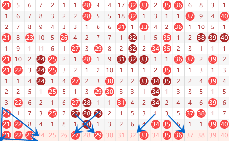 本期的21 22 23我们要注意一下,出连号的机会很大,尤其是其中的22号数字我们可以重点关注一下。本期的中心对称号码27 29我们要注意落下一个号码来。本期的33号数字我们也是要关注一下,出号机会很大。连号34 35我们要注意出重号的情况。