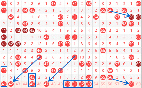 该区间的42号数字我们要注意一下,42 44 46形成饿了斜连号,本期的47号数字也是这样的,它和49 51形成3斜连,我们可以关注一下。本期的50 51 52 53我要重点注意一下,有可能出3连号来,我们要做好防守。本期的59号数字我们要做好防守,它跟56的关系很密切,所以本期开出的机会还是有的。