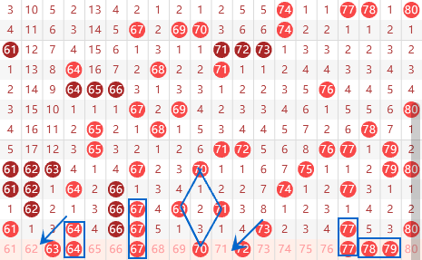 该区间的63 64本期我们要注意同出的情况,而且连号空一带号64 66 67号本期我们也是要注意出重号的情况,重点考虑一下64 67出重号的情况。本期的70号数字我们也是可以关注一下,它是属于平行四边形号码。本期的77号数字我们要注意一下。