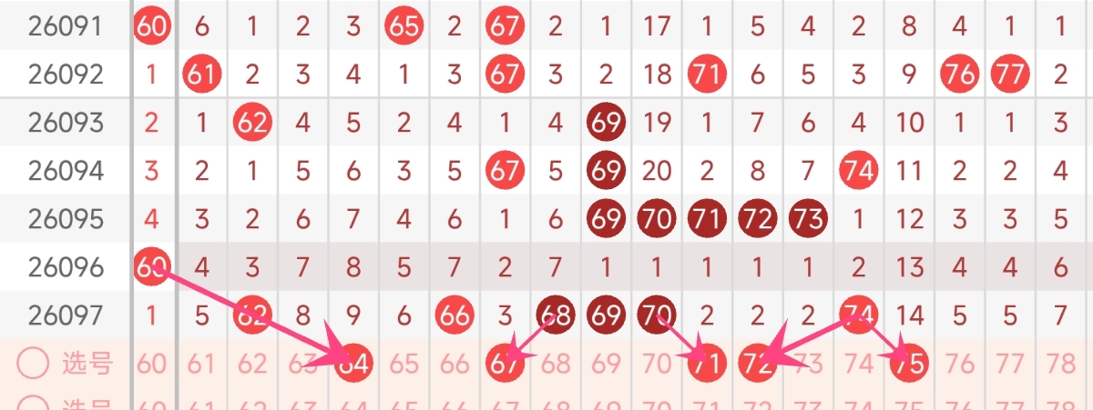 上期高区开出62、66、68、69、70、74六个号码,延续了高区整体出号频率较高的特征,符合快乐8高区出号偏多的长期规律。从走势来看,高区已经连续多期出号超过5个,保持了稳定的热度,本期依然可以维持较高的选号数量,建议选择4-6个号码。连号方面,上期开出了68、69、70一组三连号,连号热出的趋势明显,这种连号活跃的走势往往会延续一两期,本期可以继续防范连号组合出现。而且还需注意其他已经连续多期漏出的号码,本期有几率回补综合考虑,本期四区推荐关注号码:64、67、71、72、75。