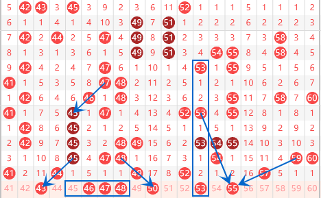 本期的43号数字我们要注意一下,它是属于三斜连号码,和前面的45 46 47刚好对应,出号机会还是有的。连号空一带号45 47 48号数字本期我们要注意落号情况,重点关注一下47 48号数字的落号情况。本期的50号数字我们可以关注一下,本期的还是有可能开出来的,它是属于三斜连走势。本期的中心对称号码53 55号数字我们也是要注意落下一个号码的情况。