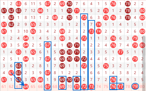 本期的64号数字我们要注意一下,最近期数中63 65都是把64夹出来了,所以本期我们就要注意一下。本期的67号数字是属于空一对称号码,我们可以防守一下的。上期开出了三连号69 70 71,本期这里我们也是要做重号的,重点关注一下69 71号数字走重的情况。本期72号数字是属于空二对称,我们可以防守一下。本期我们要注意一下76 79同出的情况,或者防守一下76 77号数字同出的情况。
