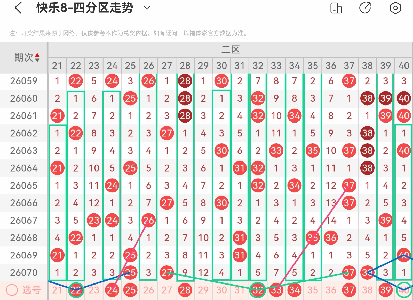 上期开出码,区间不稳,本区防3-5码开出。上期重号开出一码本期重号防一码开出,注意25.38开出重码的可能大遗漏号28.29.33上期形态走势开三码,本区形态走势有:21.22.24.26.28.30.31.32.34.35.39.401-3码, 重点关注24513走势,28159走势,32725走势以及39353走势,小防22252走势以及26173走势上期空位走势开出无,本区空位走势有:空一26,空三中心号40,空五中心号22,空九中心号32,共四码防上期斜连走势开出,本区斜连走势有本区注意重号、连码以及空位号码,隔期号码回补开出。