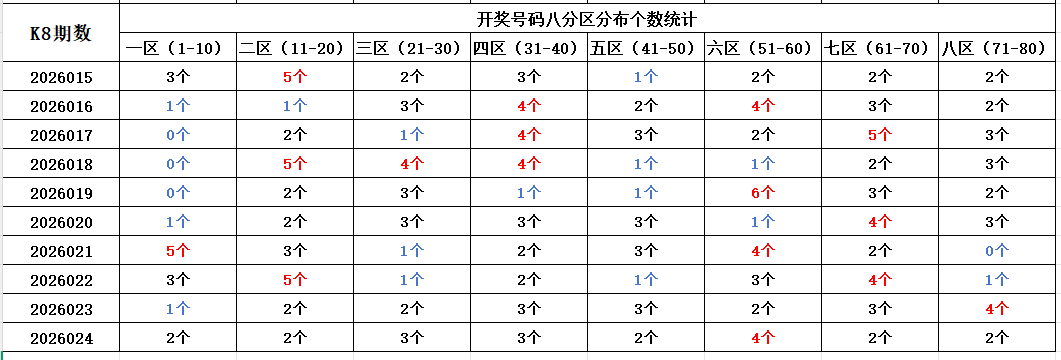 如图,红色字体是热号区,区间开出4个及以上号码。蓝色字体是冷号区,区间开出1个及以下号码。以近10期为一个分析周期,依据久热必冷,久冷必热的规律,本期重点关注:六区,区间可能开出3-4个号码。一区,区间可能开出1-2个号码。个人分析,仅供参考。