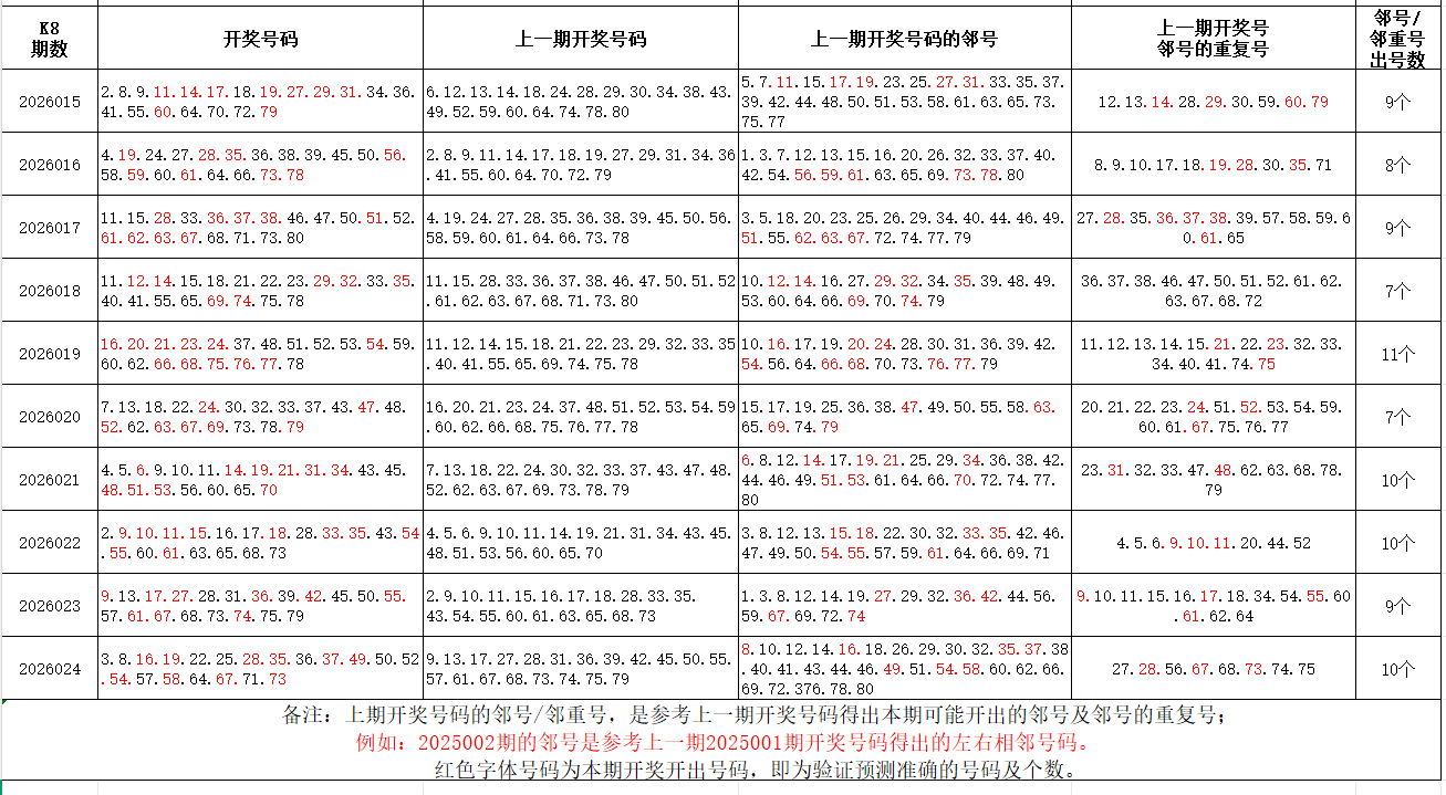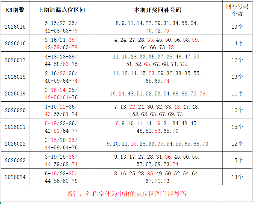 如图,上期的遗漏号码在下期开出10个左右,即为回补号码。定准点位区间首尾号码是关键!以上期2026023期为例,定位4个遗漏区间,围中13码!结合上期开奖号码,以跨度值大于或等于7为依据,本期关注4个遗漏区间:8-16/28-35/37-49/73-80;重点关注遗漏区间:2-15/21-34/43-56/63-74。点位区间号码和大底号码请勿混淆,个人分析,仅供参考。
