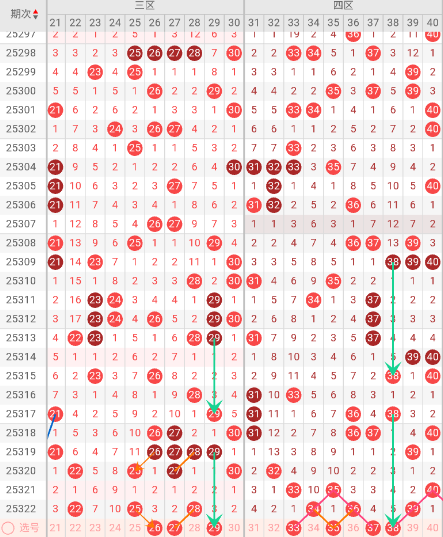 三区开出:22 25 28 奇偶比: 1:2 和值:75 跨度:6,上期开出3个号码,偶数号码占优势。本期无三斜连走势,无隔码斜连走势,近10期平均出号2.1枚。推荐关注号码:26、27。