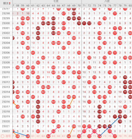 七区开出:62 65 奇偶比: 1:1 和值:127 跨度:3,上期开出2个号码,奇偶数号码均衡。本期三斜连走势:64 70,无隔码斜连走势。近10期平均出号2.1枚,本期推荐关注号码:64、68、70。