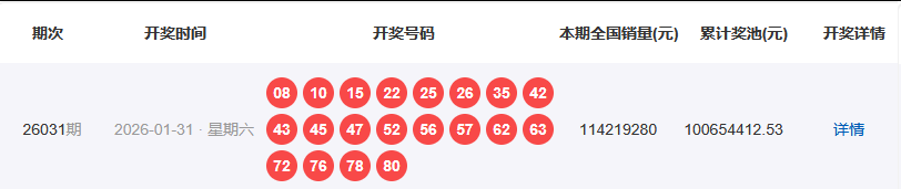 1、开奖号码:08 10 15 22 25 26 35 42 43 45 47 52 56 57 62 63 72 76 78 80