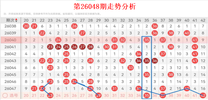 · 35:热号,近10期出现3次,尤其在043期开出,热度较高。
