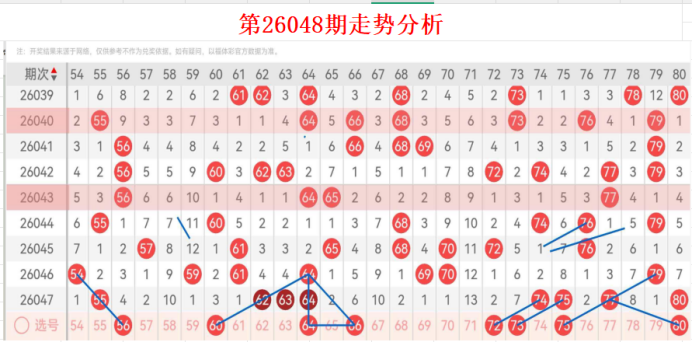 · 64:热号,近10期出现3次(如036、039期),延续性强。
