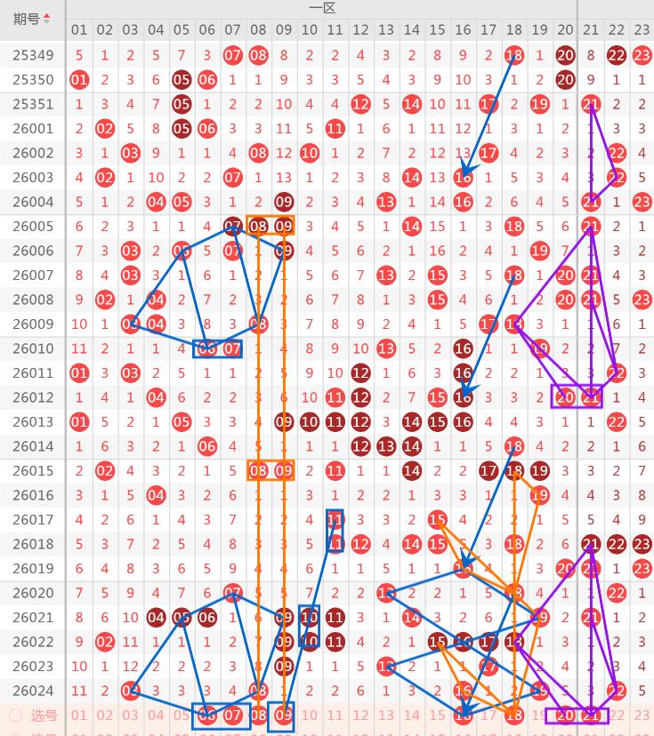 上期一区开出4个,二区开出6个,三区开出6个,四区开出4个,开出三处连号,上期整体区间开号比较平稳,本期主要关注空位的选择以及夹号的选择.