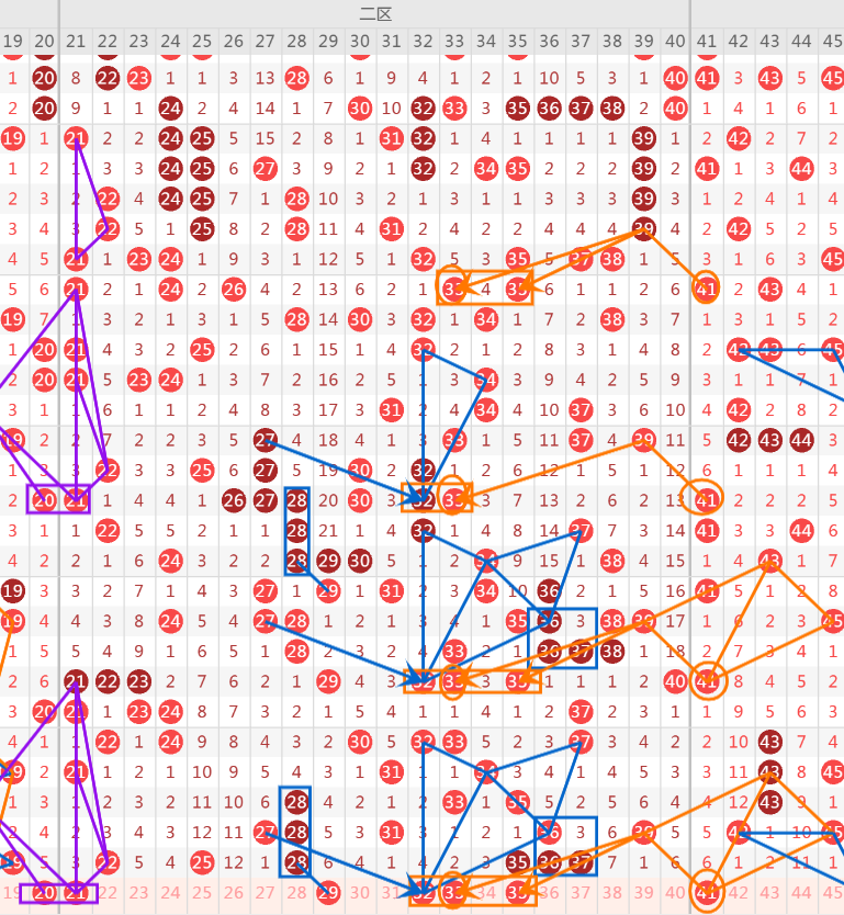 32-33:空位回补号码,上方复制走势落位点,重点关注,防同出.