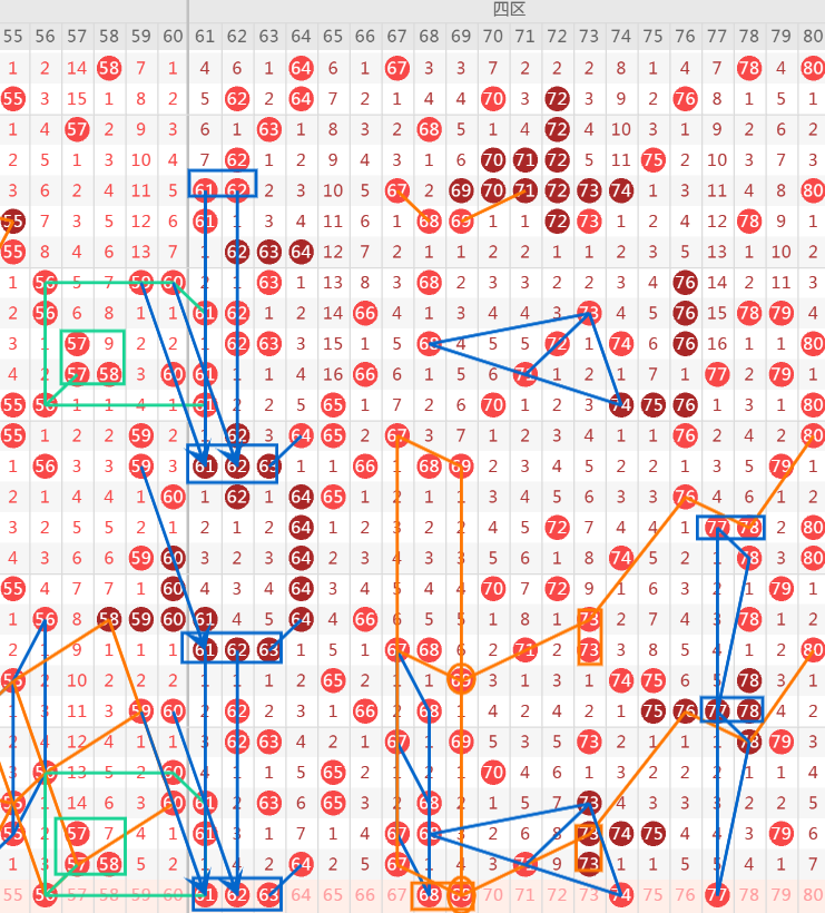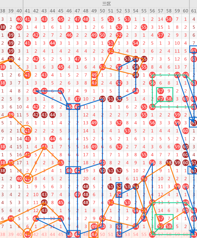 61-62:复制斜连走势,此处注意连号开出的可能,重点关注61-62.防61-62-63.