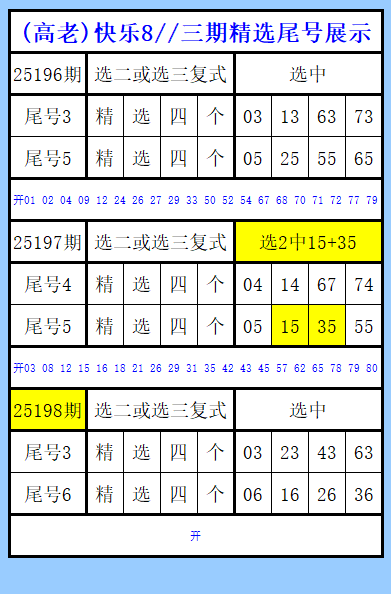 快乐8第198期图文(高老马),精选尾号推荐,上期中精选二15+35