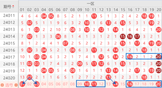 该区间的01 03号数字我们注意一下出号情况,重点关注一下03号数字的出号情况。本期的连号空一带号09 11 12号数字我们防守一下出一个号码的情况,重点关注一下10号数字的出号情况就行了。本期的14号数字我们注意一下出号情况,对称复制的是11号数字的情况,出号机会是有的。本期的16 20号数字是属于复制号码,本期我们注意一下出一个号码的情况,重点关注一下16号数字的出号情况。