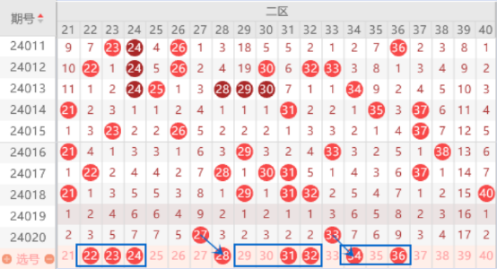 该区间的22 23 24号数字我们注意一下出连号的情况,有可能出22 23或者23 24号数字,我们可以重点防守一下。本期的28 29 30号数字我们做防守,本期不出,那么下期就可以在这里做胆码了。连号空一带号29 31 32号数字本期我们注意回补一个号码的情况,本期不出那么我们就要注意一下下期出两个号码的情况了。本期的34号数字是属于遗漏7期的号码,本期遗漏7期的号码有5个,出一个号码是没有问题的。
