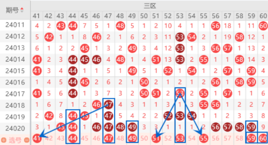 上期开出了43 44 46 47 48 49号数字,本期我们注意一下出重号的情况,重点关注一下44 47 49号数字出重的情况。本期的51 55号数字我们注意一下出号情况,这里应该会出一个号码。三连号52 53 54号数字本期我们也是要注意落下一个号码的情况的,重点关注一下53号数字的出号情况。上期开出了56 57 58 59号数字,本期我们注意一下出一个重号的情况,重点关注一下58 59号数字出一个重号的情况。