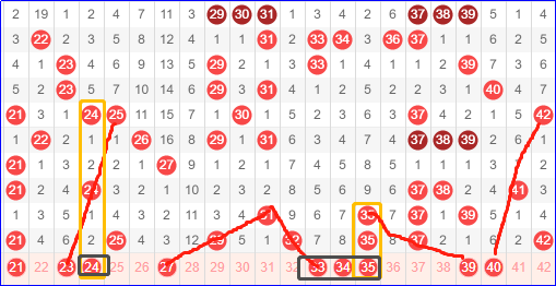 第二区间号码21-40,二区本期开奖号码个数六个,比之前有所增加,唯一不好看的地方就是本期没有连号出现,但至少有一点回暖的迹象出现,下一期可以开始着手布局了。