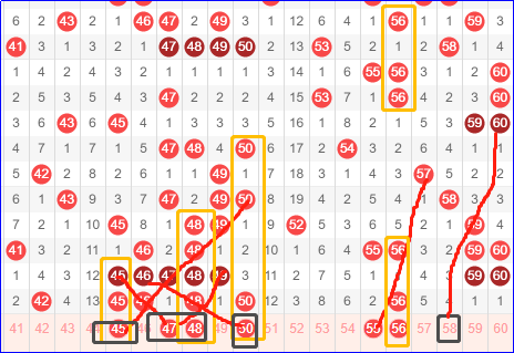 第三区间号码41-60,昨天的扎堆作号还是找对了方向,此处再次开出四个号码,本期依然可以在这里布局,需要注意的是依然是连号防守。