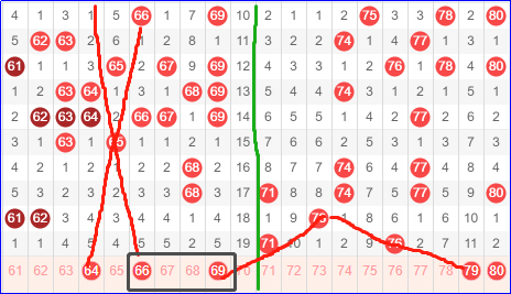 第四区间号码61-80,截止上一期,四区可以判定为冷区了,接下来需要观察再做号了,后半段会不会走出一区的情况,我们拭目以待,但是前半段冷成这个样子实在是不应该,在没有明显转热的情况下,不妨先观察一下。