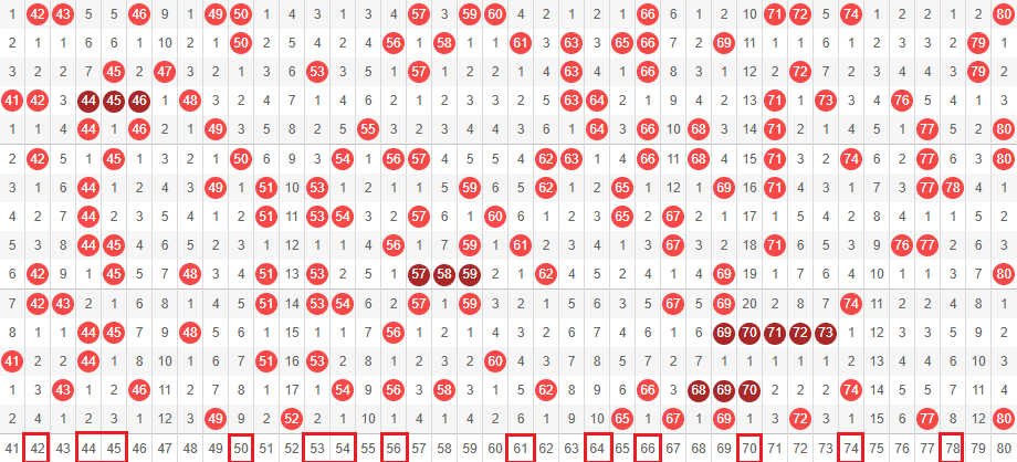 接下来我们一起看走势图,我们把01-40分为前区,41-80分为后区。