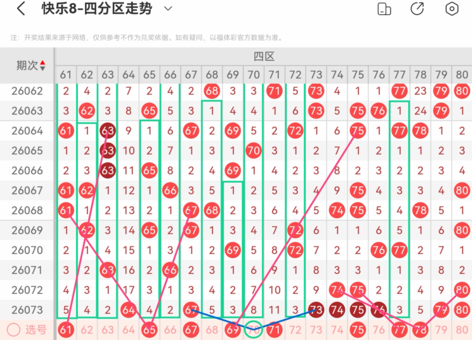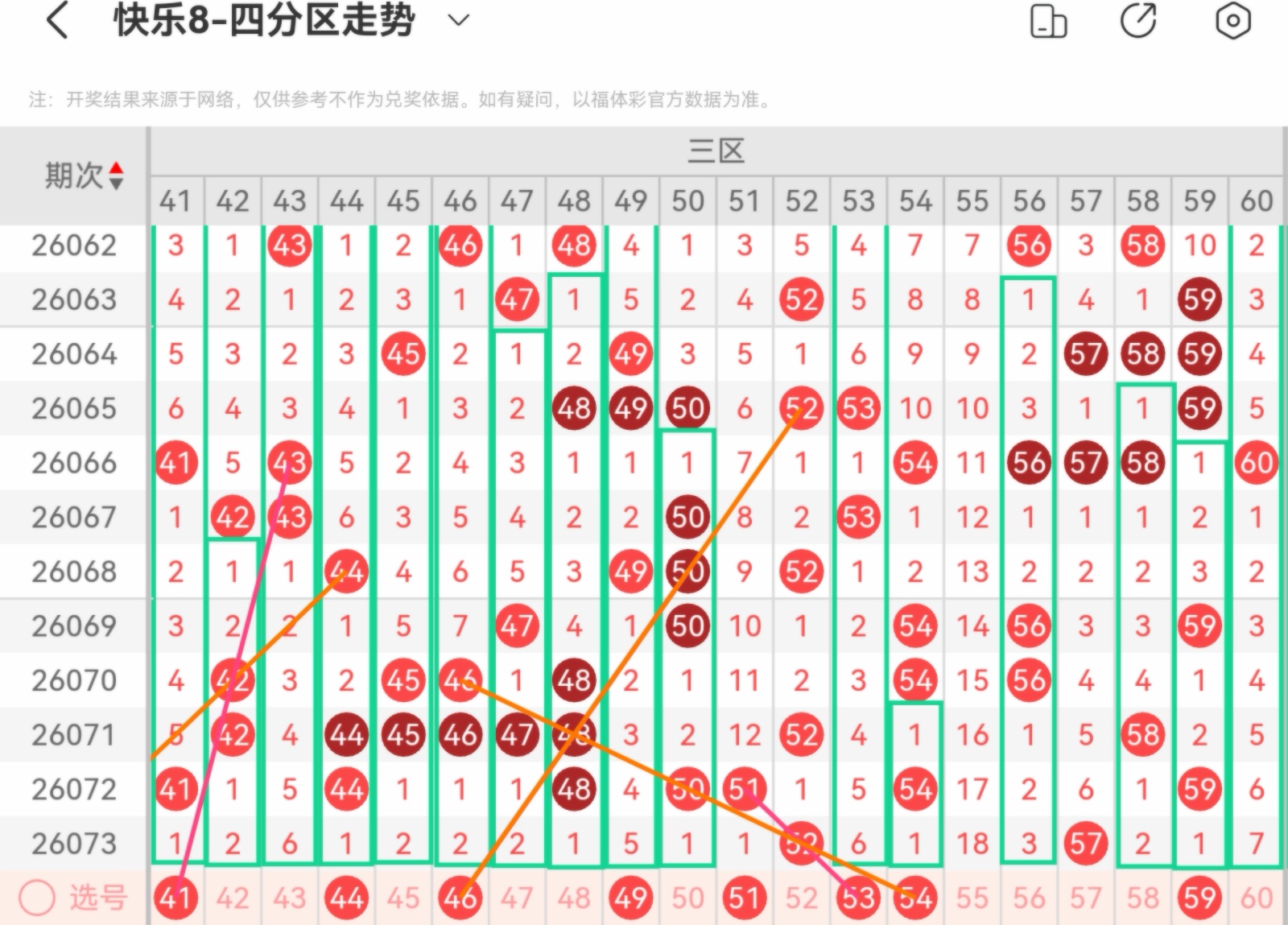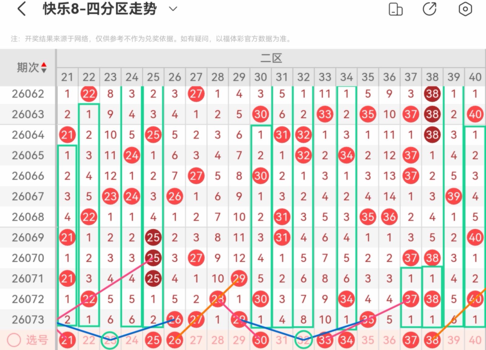 大家好,我是甜丝丝的坏事,主要以快乐八的形态走势、空位走势、遗漏走势以及斜连走势相结合的方法,用公认的四分区走势来进行预测分析,希望能让你有所收获。