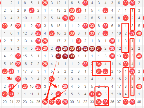今日三区号码建议参考27的顺位斜连,防27 28对子号下落,复制前端20 21的走势,建议参考26的隔期斜连,防29下落形成人字型形态,今日四区号码建议参考34 35的的小三角形态,四区后区建议参考38的等期遗漏,防38 39对子号同时下落,今日三区四区推荐号码26 27 28 29 34 35 38 39