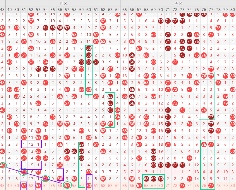 边号53 55 57 59 61 63出一码,重号54 56 58 62出一码,重号断3期,四区走热趋势,本期比较看号有重号,58 54优先,57是斜连号,上图已勾画,51 53比较喜欢同出可以同期遗漏可以选1码,三直落隔3期回补次数比较多,本期59有机会出,6开头应该有一码,防60,关注五码 53 56 58 59 60防57