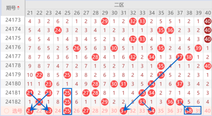 本期的21 23号数字是属于交叉对称号码,本期我们注意一下出一个号码的情况,可以重点关注一下23号数字的出号情况。本期的27和31都是属于空三中心号,本期的空三中心号码有4个,出一个的机会是很大的,所以我们重点关注一下27 31号数字出号情况。本期的34号数字我们注意一下出号情况。上期开出了36 37号数字的连号,本期我们注意一下出重的情况。本期的38号数字我们注意一下出号情况。