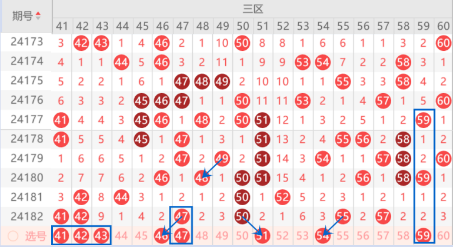 本期的41 42 43号数字我们注意一下出连号的情况,其中的42号数字我们重点关注一下出现3重的情况。上期开出了47号数字,本期我们防守一下出现重号的情况,分边的情况也是要注意一下出号情况,这里可以防守一下46 47号数字号数字的同出情况。本期的51号数字我们注意一下出号情况,毕竟上期开出了50号数字的三重号,本期走分边的情况。本期的54号数字我们注意一下出号情况,上期开出了55号数字,本期是有机会走分边的。本期的58 59号数字都是属于空二对称号码,出一个号码的机会很大,我们重点关注一下。