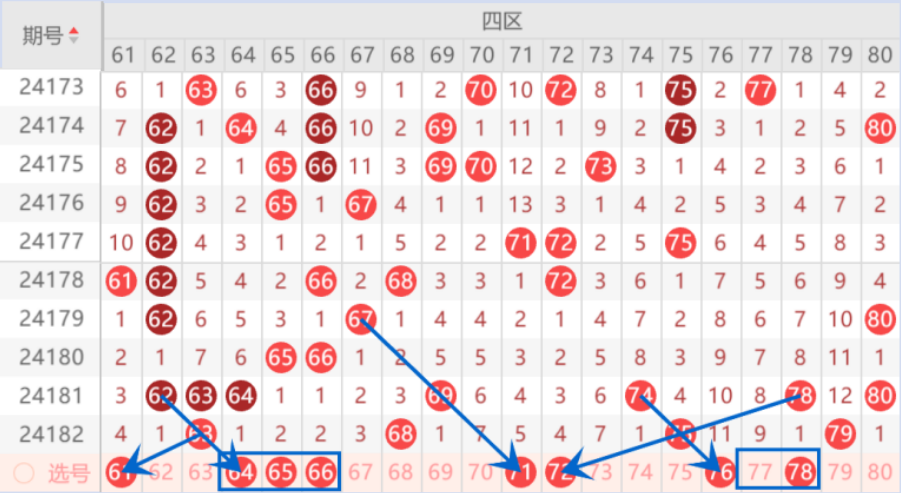 本期的61号数字我们注意一下出号情况,毕竟上期开出了63号数字的重号,本期的59 61号数字出一个号码的情况。本期的65 66号数字我们注意一下出一个号码的情况,其中的66号数字我们可以重点关注一下出号情况。本期的71 72号数字我们注意一个号数字的情况。本期的76 77号数字我们重点关注一下出出一个号码的情况,其中的76号数字我们可以重点关注一下。