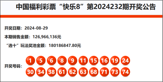首先我们先来回顾快乐8第2024232期开奖号码:
