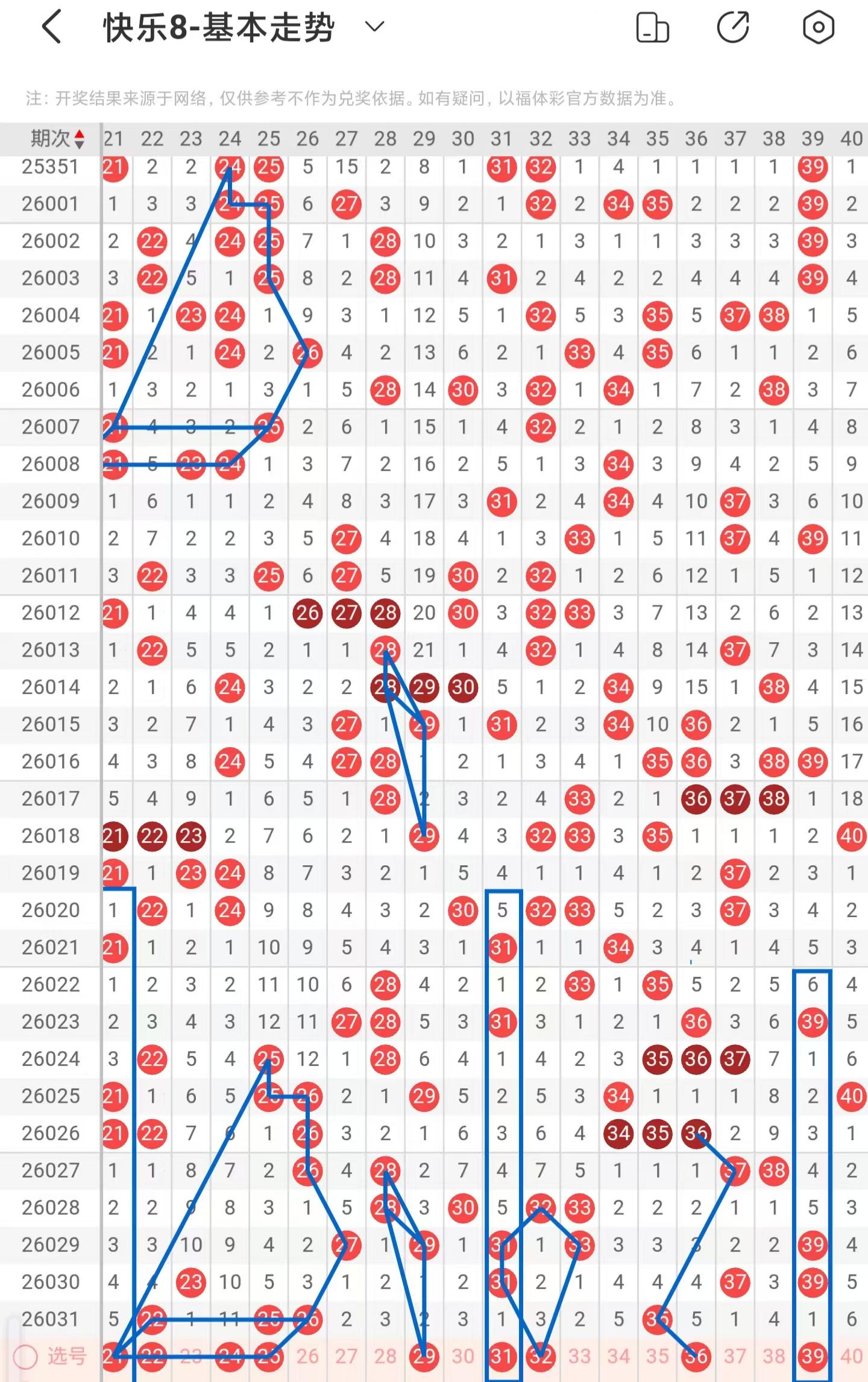 二区间稳定落号,一共开出四个号码球,本期考虑等同数量的号码球,注意隔期递增开出的21号码球,注意近期25、26、27号码球的走势与24、25、26号码球的走势相似,本期注意22、24、25号码球,注意近期28、29号码球的走势相似,本期注意29号码球,注意隔期对称回补的31号码球,防守百期相似形态的32号码球,注意百期相似形态的36号码球,同时也是隔期对称回补号码球,注意期数和值加减法的39号码球,防守40号码球,因此二区间关注21-25-29-36-39。注意本区间的选二复式21-25-36。