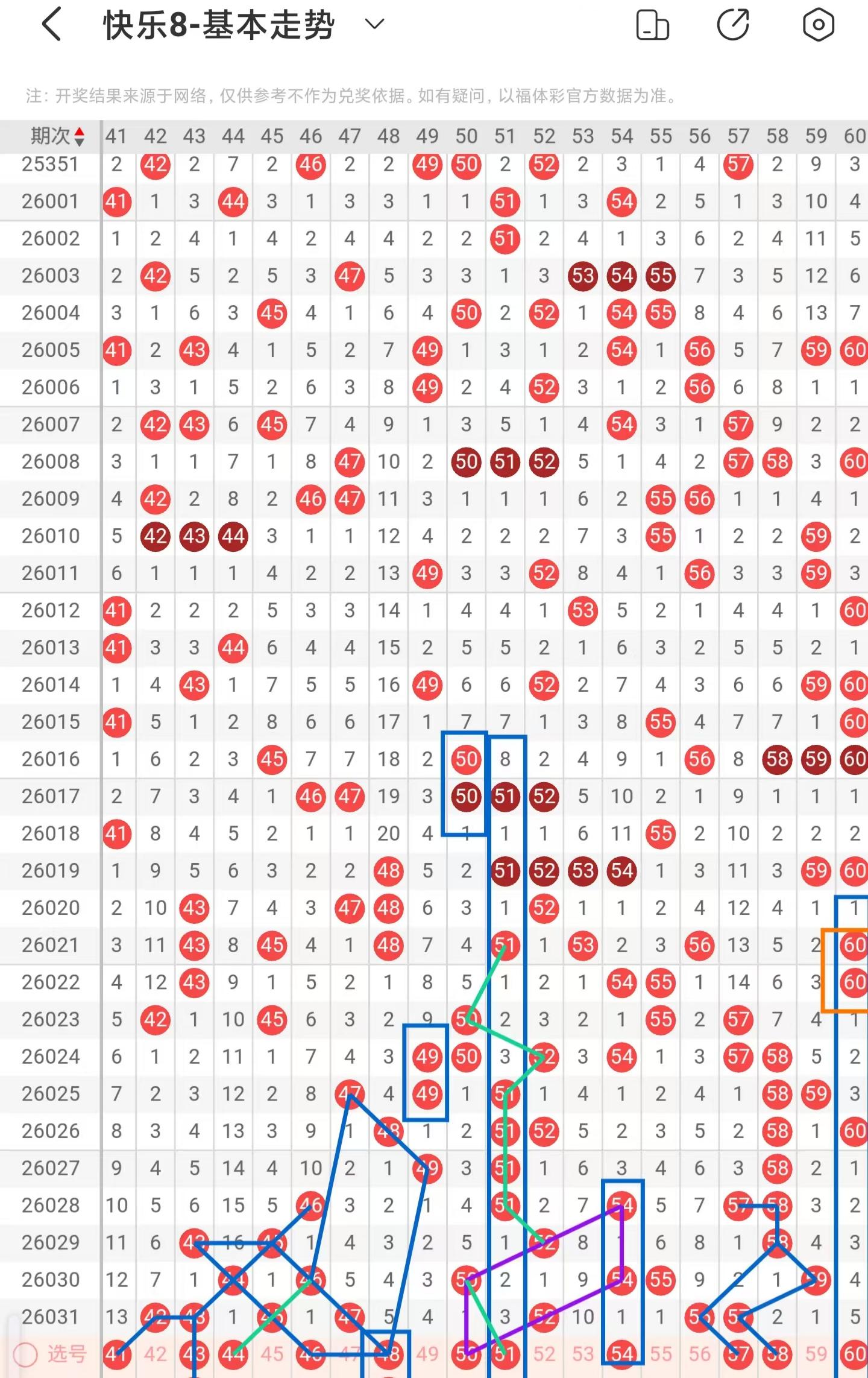 三区间上期稳定落号,一共开出七个号码球,本期考虑减少号码球的数量,以50号码球为对称走势起点,注意走势形态的41号码球,注意斜连转直连走势的43号码球,以45号码球为交叉中心点,注意分边落号的44、46号码球,同时44号码球也是百期相似形态号码球,注意斜连走势构成平形四边形形态的48、50号码球,注意阶梯落位重码走势的48号码球,注意期数和值加减法的51号码球,注意隔期对称回补的54号码球,注意百期相似形态的57、58号码球,注意隔期递增的60号码球,同时也是直连转斜连走势的号码球,因此三区间关注44-48-54-57-60,注意本区间的选二复式48-54-60。