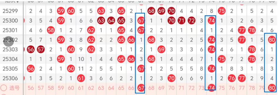 第四区间的走势分析:第四区间上期开出了四个号码球,主要的落号点位在四区间的后半区,走出了两奇两偶的形态走势,上期四区间前半区龙头和凤尾同时落下,后半区落下一个冷码组合的姊妹对,整体 走势趋向于走冷,根据四区间的走势规律,今天的四区间我们主看前半区67这个号码球的落位,也是热码的夹码,回补的机会很大,再看后半区74这个号码球热码的隔期回补,以及凤尾80的落位,这三个号码球,建议大家可以打个三胆拖或者三码复二,参考为主!