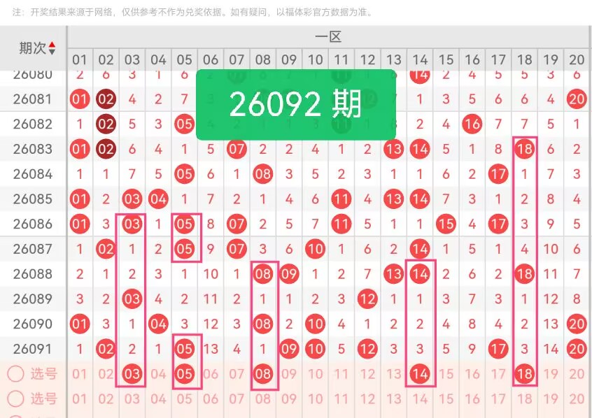 上期第一区间开奖7个号码,本期可能会减少开出。03为一区小号奇数,是近期较少露面的冷号,具备回补潜力;06是一区中号偶数,走势长期处于温态,无明显冷热波动,稳定性强;08是一区热号,上期虽未开出,但前期连续多期有出号表现,延续热号能保住一区基础热度;14为一区中号偶数,与上期一区奇数占比形成互补,让区间奇偶比例更均衡;18是一区大号偶数,属于温和型号码,既填补了一区大号的号码空缺,又避免了扎堆出号。