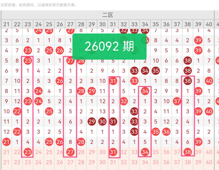 上期第二区间开奖5个号码,本期可能会稳定开出。23是二区小号奇数,为近期热号,近期多次出号,延续该号码能维持二区的基础热度;27是二区中号奇数,走势偏冷,多期未开出,具备回补的可能性;31是二区中号奇数,属于温和型号码,无明显波动,是二区的稳定出号点;34是二区中号偶数,是上期二区出号的延伸号码,承接了上期二区的出号脉络,保证区间走势的连贯性;38是二区大号偶数,同样处于冷态,与27形成冷热搭配,让二区号码层次更丰富。