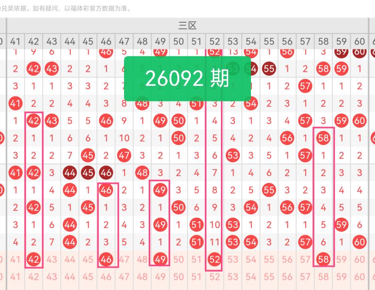 上期第三区间开奖个6号码,本期可能会减少开出。42是三区小号偶数,为冷号,多期未开出,具备回补潜力;46是三区中号偶数,走势温和,是三区的常规出号,稳定性强;49是三区中号奇数,属于冷号,前期长期未出,符合冷区号码集中回补的规律,是本期三区的重点补号;52是三区中号奇数,为热号,上期虽未开出,但前期连续出号表现活跃,延续热号能保住三区核心热度;58是三区大号偶数,处于温态,填补了三区大号的空缺,让区间大小号分布更均衡。