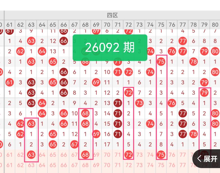 上期第四区间开奖2个号码,本期可能会增加开出。63是四区小号奇数,2期未开出,是冷区回补的核心候选号码;68是四区中号偶数,走势平稳无波动,是冷区中相对稳定的出号点,能为回补提供基础支撑;72是四区中号偶数,同样为冷号,与68形成冷热搭配,丰富区间号码层次;75是四区大号奇数,属于冷号,填补了四区大号奇数的空缺,让区间奇偶比例更均衡;79是四区大号偶数,处于冷态,是四区末端的关键补号。
