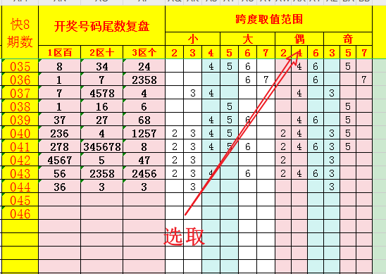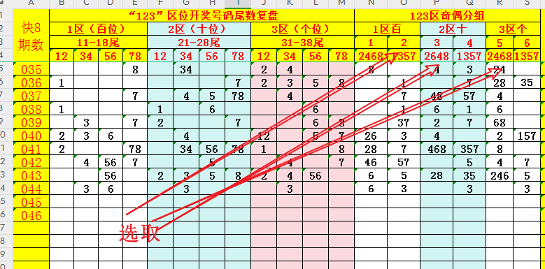 再次,将"1-2-3"区(百位-十位-个位)的号码尾数1至8分别按照偶奇分组,即:偶尾为2468、奇尾为1357。