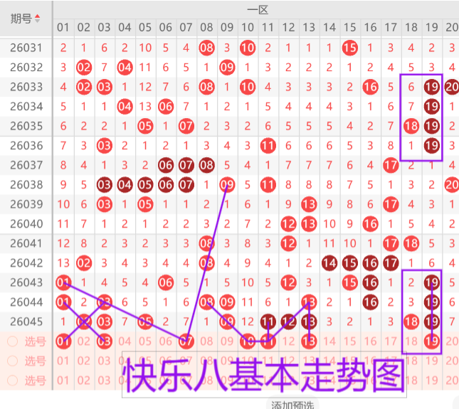 我们先来看下一区的基本走势情况,上期开出了九枚开奖号码,达到了近百期的峰值,本期预计开出3-4枚开奖号码,首先我们来看01 03的交叉走势建议二选一。07的奇数斜连第四期走势,可以考虑07 11双码同出。重点防守夹号遗漏12期的10. 13 19重号二选一。